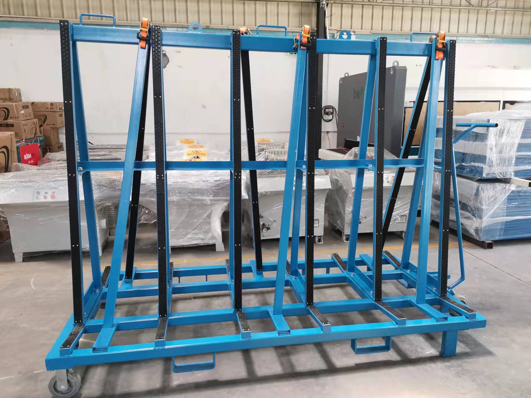 此設(shè)計(jì)用于廠區(qū)內(nèi)外的板材運(yùn)輸和儲(chǔ)存,支架表面覆蓋一層橡膠層,保護(hù)板材免于刮傷。
